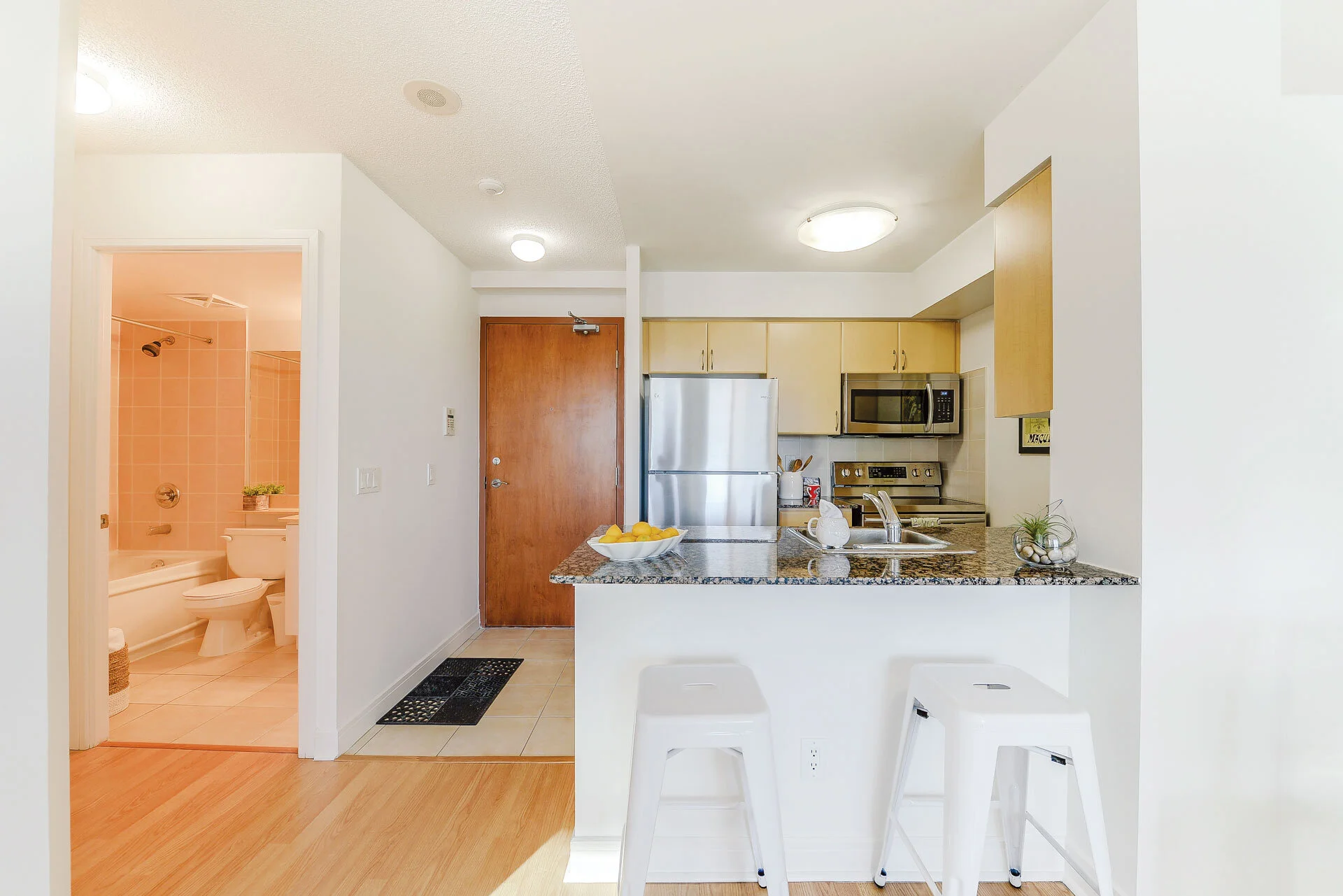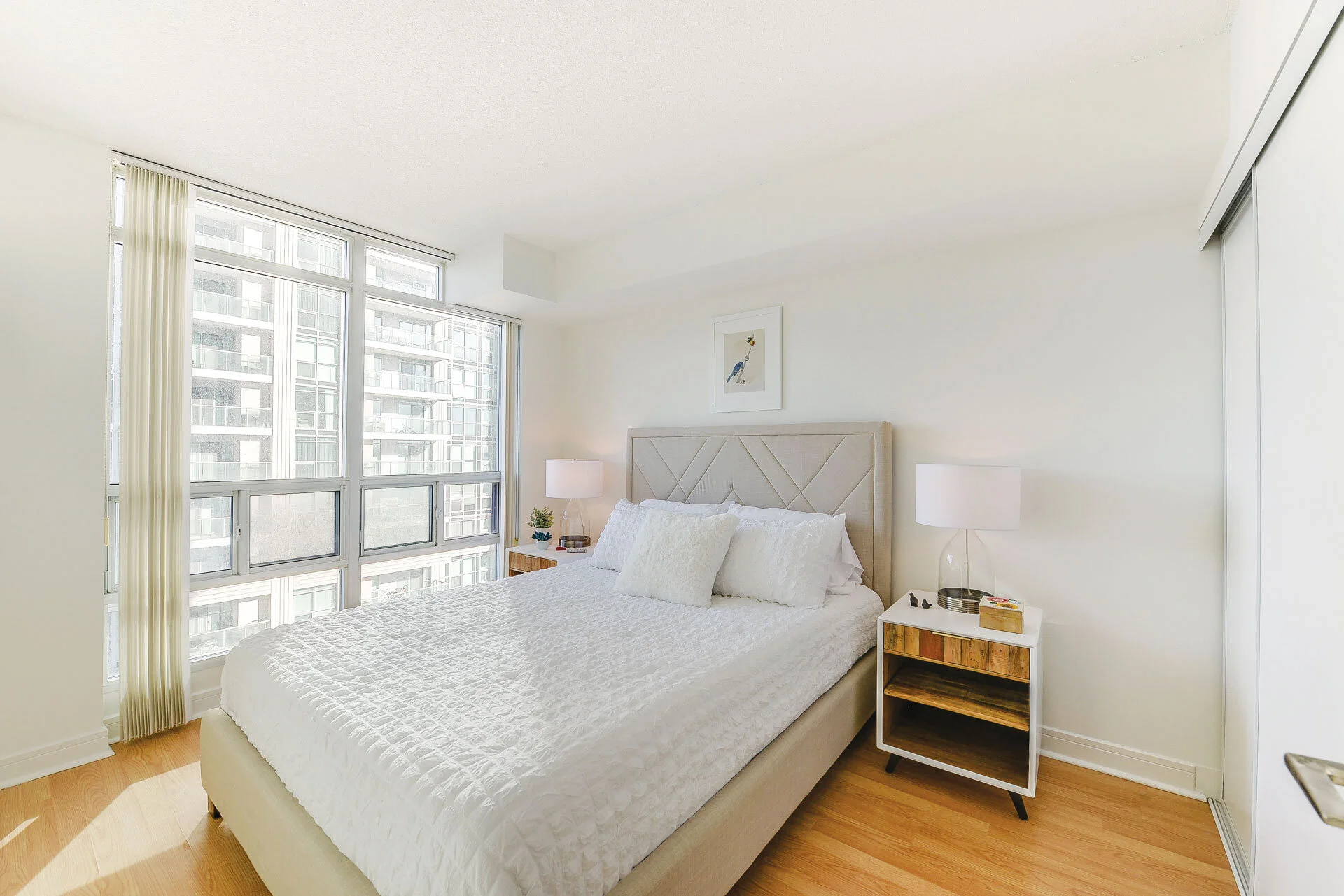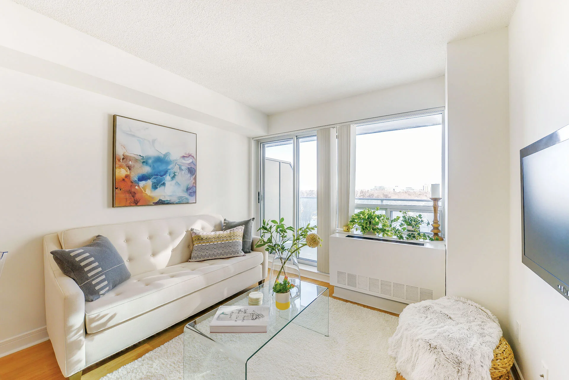 For one of our realtor clients, the goal was to create a bright, fresh, beautiful, modern feel that showcased the space to feel spacious, inspirational and welcoming. All accessories are from my personal collection. Items that were rented include: couch, rug, TV, coffee table, dinette table, chairs, stools, bed frame, bedside tables, lamps - which were all painstakingly curated, sourced and procured for this successful staging.