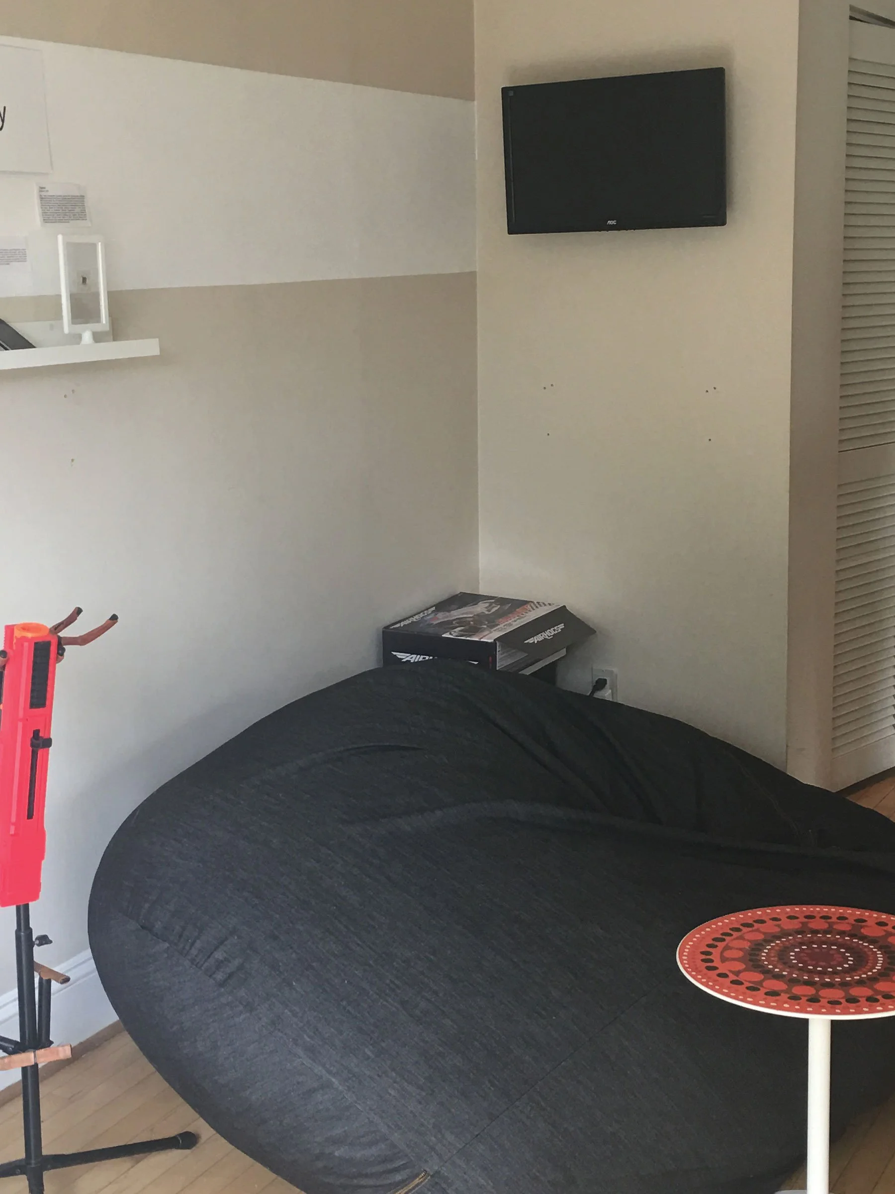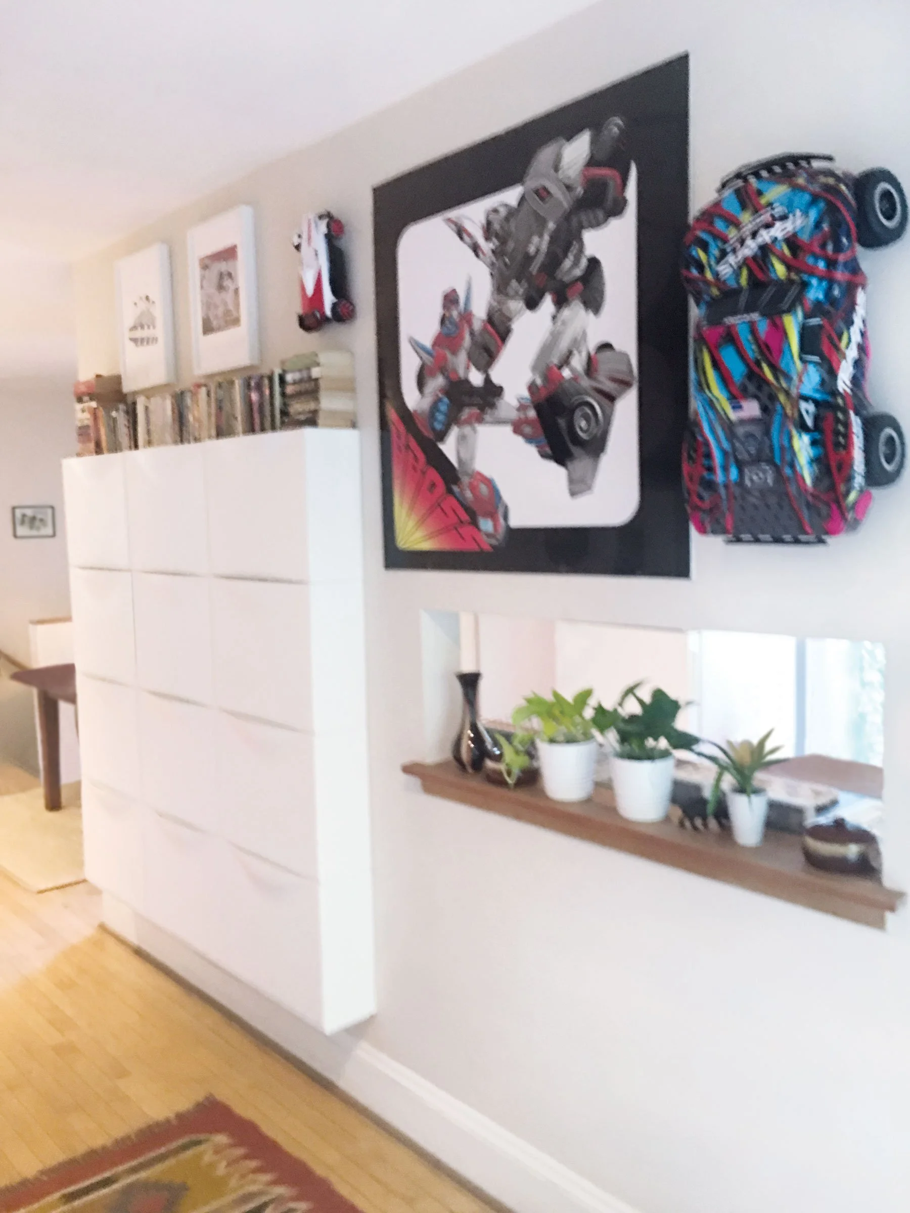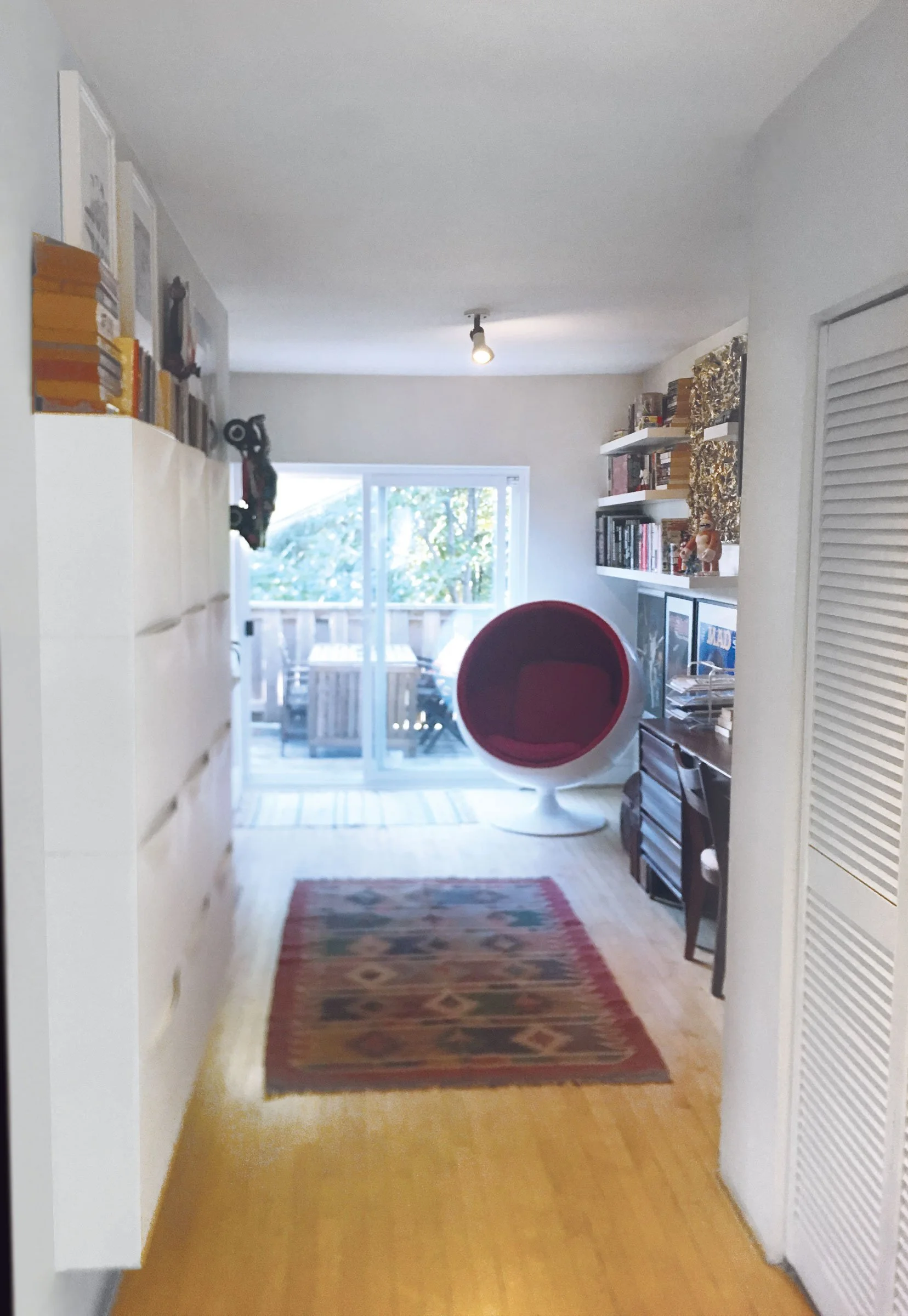 Adding to the design, purchases from IKEA, shelving, storage and some decor items. I created a wall unit from stackable shoe cabinets. The end result is a smarter use of the space that adds functionality, storage and visual fun!