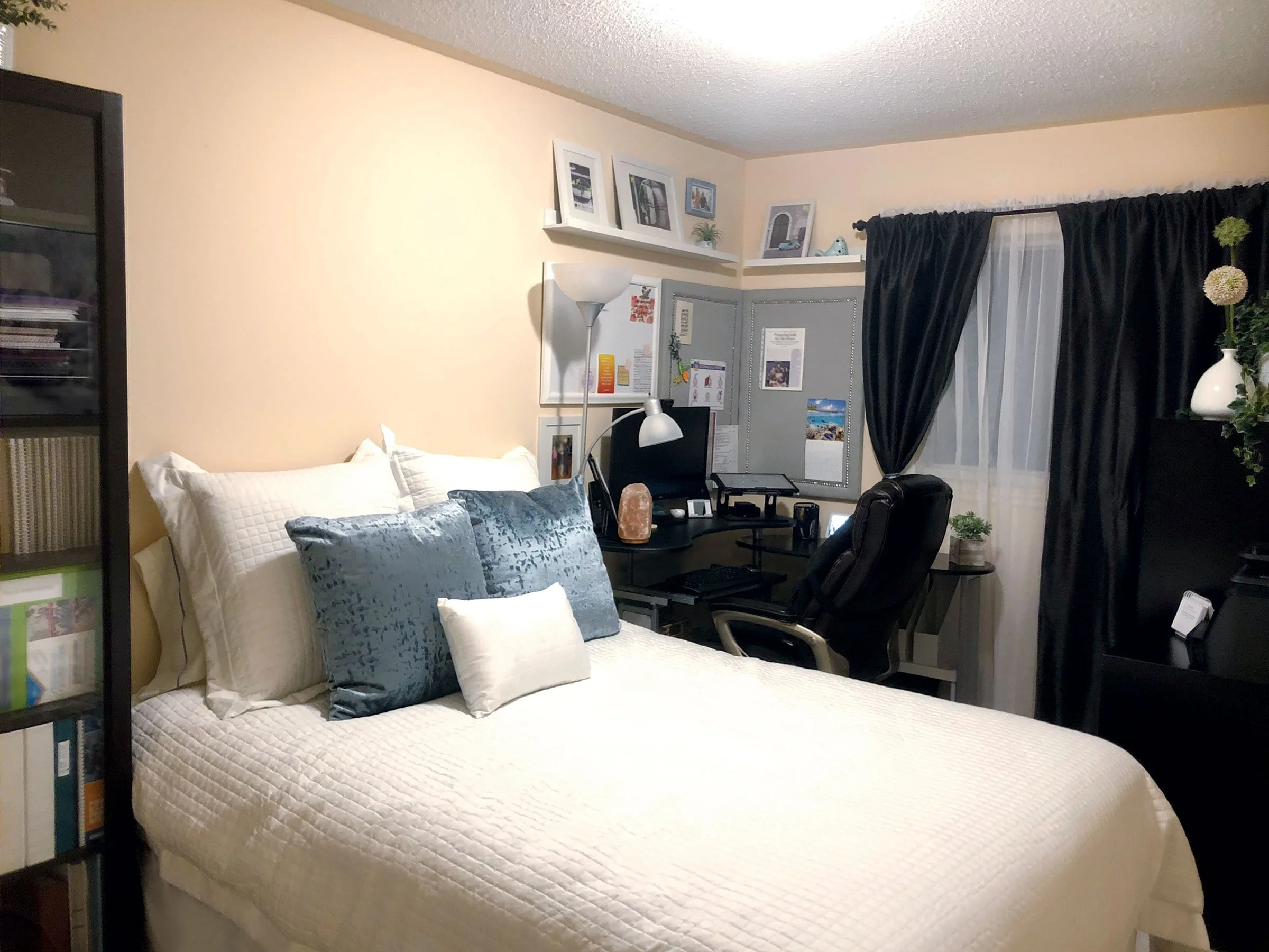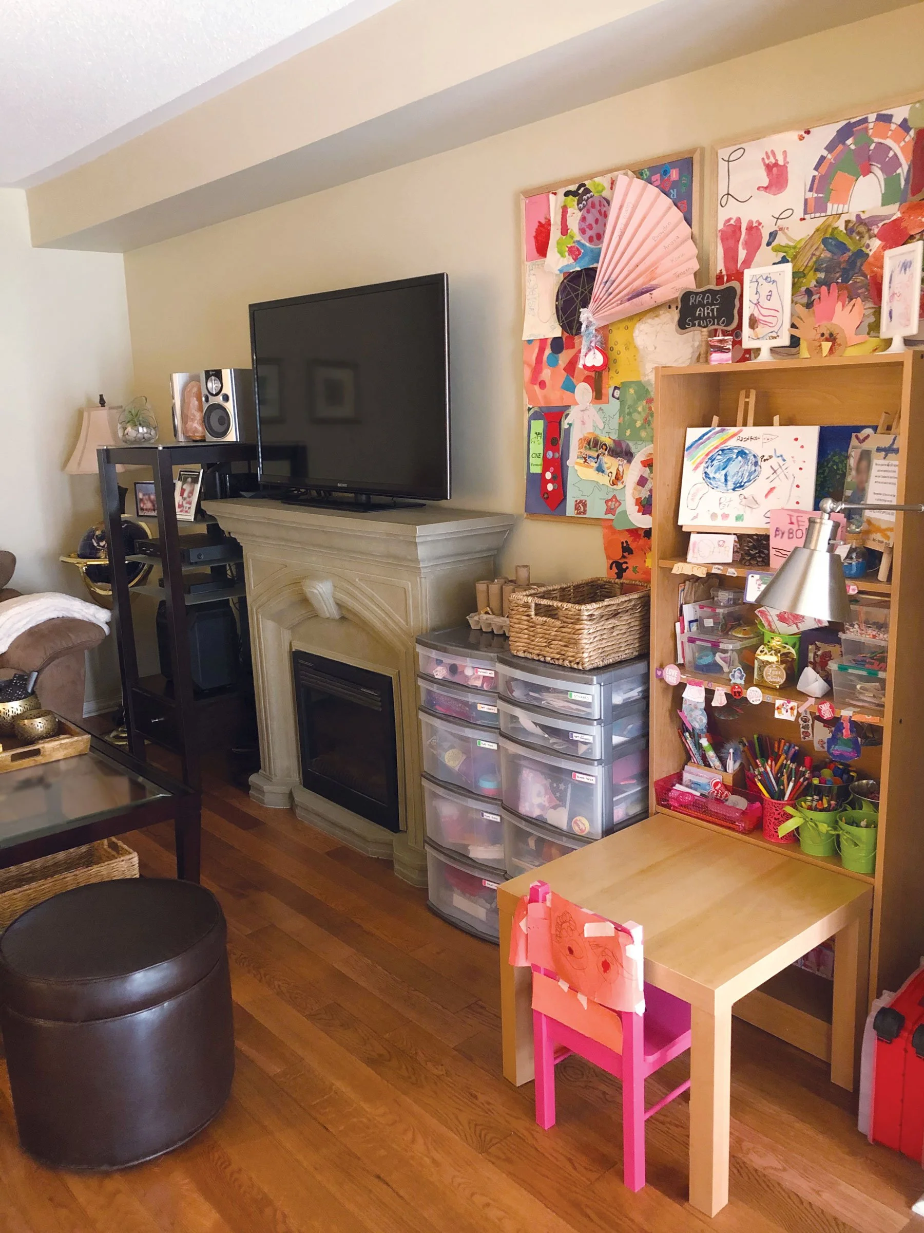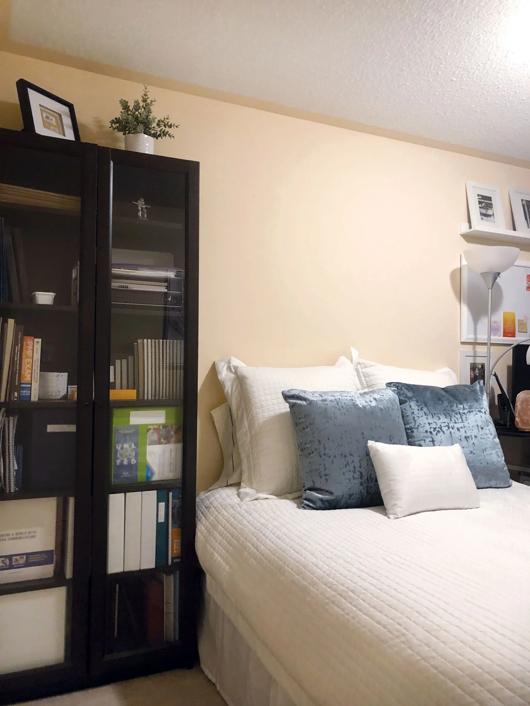 The living room had to serve as three spaces: playroom, tv/entertaining, arts & crafts. The home office moved out of the main bedroom which should only be for rest and relaxation and created the guest room to also be a home office. We took a couple of shopping trips together where I coached my client on what to look for. Through my continued coaching my client proceeded to have much fun doing all their own shopping for new decor and organization items which they would bring back for us to work with together. They discovered they loved blue! My client and their family blossomed.